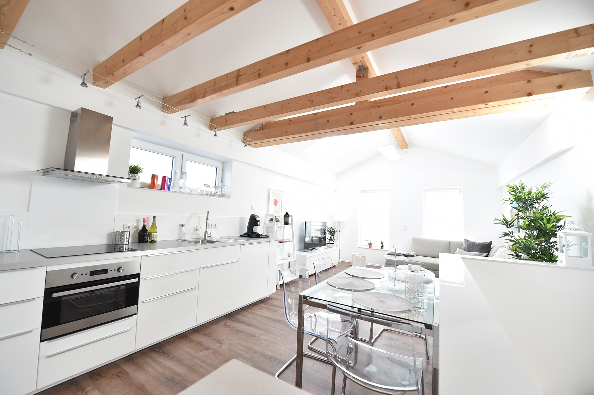 Das Wohnzimmer liegt im ersten Obergeschoss und ist über eine breite, sehr moderne Treppe zu erreichen. Neben einer integrierten, top-modernen Küchenzeile mit einer Hochglanz-Lackfront wurde ein schöner Essbereich sowie ein sehr gemütlicher Wohnbereich mit großer Couch und einem großen Samsung Flatscreen, der zum Entspannen und Chillen einlädt. Designerbeleuchtung, kreative Dekoration und moderne Wandbilder runden das Ambiente im Obergeschoss ab.